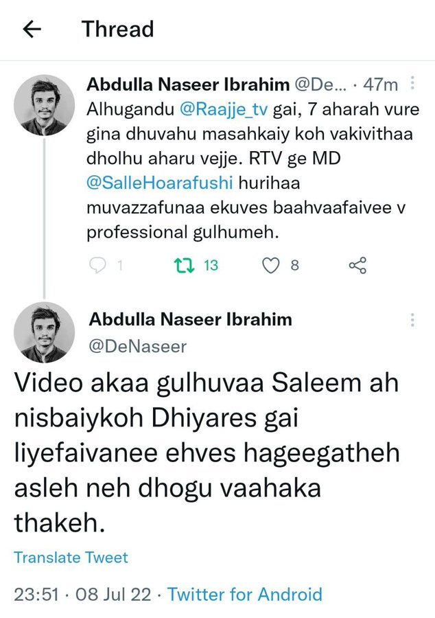 ނަސީރު އެއްޖިންސުން ގުޅުންހިންގިކަމަށް ތުހުމަތުކުރެވޭ މައްސަލައާއިި ގުޅޭގޮތުން އޭނާ ކުރި ޓްވީޓްގައި ވަނީ ރާއްޖެ ޓީވީގައި 7 އަހަރަށްވުރެ ގިނަ ދުވަހު މަސައްކަތްކޮށް ވަކިވެފައިވާތާ ދޮޅު އަހަރުވެފައިވާކަމަށެވެ. އަދި ރާއްޖެ ޓީވީގެ އެމްޑީ ސައްލެ ހުރިހާ މުވައްޒަފުންނާ އެކުވެސް ބާއްވަމުނާފައިވަނީ ޕްރޮފެޝަނަލް ގުޅުމެއްކަމަށް ނަސީރު ބުންޏެވެ.