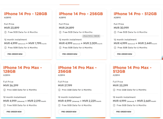 ދިރާގުން އިންސްޓޯލްމަންޓުކޮށް ފައިސާ ދައްކައިގެން އައި ފޯން 14 ގަނެވޭގޮތަށް ޕްރީ އޯޑަރތައް ނަގަމުންދާއިރު، ކޮންމެ އޮޕްޝަނެއްގައިވެސް މަހުން މަހަށް ދައްކަންޖެހޭ އަދުގެ އިތުރުން ޑައުން ޕޭމަންޓުގެ ގޮތުގައި ދައްކާންޖެހޭ އަދަދުވެސް ހިމަނާފައިވެއެވެ. މިއިން ކޮންމެ އޮޕްޝަނަކާއެކު، ފްރީ ޑާޓާވެސް ހިމަނާފައި ވެއެވެ.