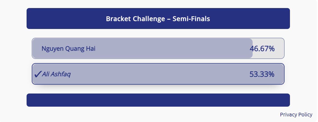 "އޭއެފްސީ ބްރެކެޓް ޗެލެންޖް"ގެ ފައިނަލުގެ ފުރަތަމަ ޖާގަ ހޮންގ ކޮންގްގެ ސައުތް ޗައިނާ ކްލަބަށް ކުޅެމުން އަންނަ ޗޭން ސިއު ކީ ވަނީ ހޯދާފައެވެ. އޭނާ ފައިނަލްގެ ޖާގަ ކަށަވަރުކުރީ ސެމީ ފައިނަލުގައި މެލޭޝިއާގެ ސަފާވީ ރާޝިދްގެ މައްޗަށް ކުރިހޯދައިގެނެވެ. މިއަދު މެންދުރު 13:00 އަށް ވޯޓުލުމުގެ ވަގުތު ހަމަވިއިރު ޗޭން ސިއު ކީއަށް ލިބިފައިވަނީ ވޯޓުލީމީހުންގެ 51.61 އިންސައްތަ ވޯޓު ހޯދައިގެނެވެ. ސަފާވީ ރާޝިދަށް ލިބިފައިވަނީ 48.39 އިންސައްތަ ވޯޓެވެ.