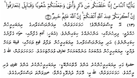 ދުނިޔެ އެއްބައިވަން ކުރުވާނީ ކިހިނެއްތޯ ފްރީމޭން، ޤާރީ އާނިމްއާއި ކުރި ސުވާލުގެ ޖަވާބު ޤާރީ ދެއްވީ، ކީރިތި ޤުރުއާންގެ އަލް ހުޖުރާތު ސޫރަތުގެ 13 ވަނަ އާޔަތުންނެވެ. އެ އާޔަތާއި އަދި އާޔަތުގެ ދިވެހި ތަރުޖަމާ ތިރީގައި މިވަނީއެވެ.