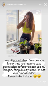 ޕޫމާ އިންޑިއާ އިން އެ މީހުންގެ ސޭލްއެއް އިޝްތިހާރު ކުރުމަށް އިންސްޓަގްރާމްގައި އަނުޝްކާގެ ފޮޓޯތަކެއް ވަނީ އާންމުކޮށްފައިއެވެ. އަނުޝްކާ  ޕޫމާ އުފެއްދުންތަކެއް ލައިގެން ނަގާފައިވާ ފޮޓޯތަކެއް،  ޕޫމާ އިންޑިއާގެ ޕްރޮމޯޝްނަތަކަށް ބޭނުންކުރާތީ އިންސްޓަގްރާމް ސްޓޯރީގައި އާންމުކުރި ޕޯސްޓެއްގަައި އަނުޝްކާ ހިތްހަމަނުޖެހުން ވަނީ ފާޅުކޮށްފައިވެ އެވެ.