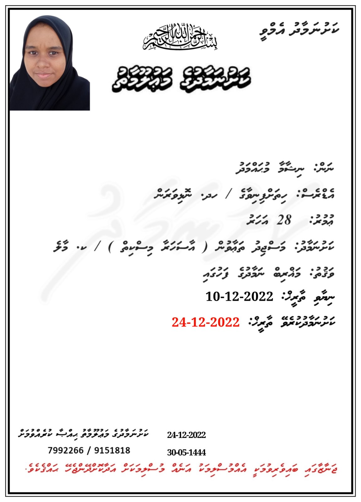މިމަހުގެ 10 ވަނަ ދުވަހު މަރުވެފައި އޮއްވާ ފެނުނު ހދ. ނޮޅިވަރަމަށް އުފަން އެ ރަށު ހިތަށްފިނިވާގެ، ނިޝާމާ މުހައްމަދު 28 ގެ ކަށު ނަމާދު މިރޭ މަޣްރިބް ނަމާދަށް ފަހުގައި ބޭއްވުމަށް ނިންމައިފިއެވެ.