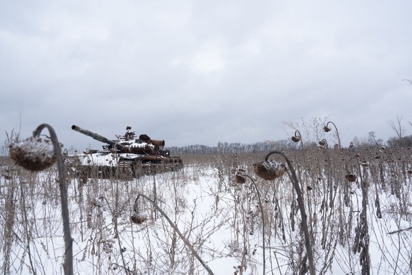 ޔޫކުރެއިންގެ އިޒިއުމްގެ ސްނޯ ފީލްޑެއްގައި, ހަލާކުވެފައިވާ ހަނގުރާމަމަތީ ޓޭންކެއް, 12 ފެބްރުއަރީ 2023
