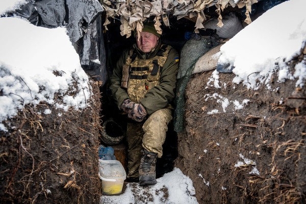 ޑޮންބަސްގެ ފްރޮންޓް ލައިންގައި, ދެކުނުން އޮންނަ ޑްރުޒްބާގައި ހަދާފައިވާ ބިންގަރާހެއްގައި ޔޫކުރެއިންގެ ސިފައިންގެ މީހަކު ހުއްޓިލައިގެން, 18 ފެބްރުއަރީ 2023