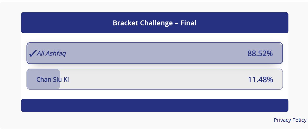 "އޭއެފްސީ ބްރެކެޓް ޗެލެންޖް" ގެ ފައިނަލުގައި ހޮންގްކޮންގެ އެންމެ ކާމިޔާބު ކުޅުންތެރިޔާ ޗަން ސިއު ކީ އާއި ރާއްޖޭގެ އެންމެ ކާމިޔާބު ކުޅުންތެރިޔާ އަލީ އަޝްފާގު (ދަގަނޑޭ) އަށް ވޯޓުލުމަށް ހުޅުވާލި ފުރުސަތުގެ ފުރަތަމަ ދެ ދުވަސް ނިމުނުއިރު ރާއްޖޭގެ އަލީ އަޝްފާޤު (ދަގަނޑޭ) އޮތީ ބޮޑު ތަފާތަކުން ކުރީގައެވެ.