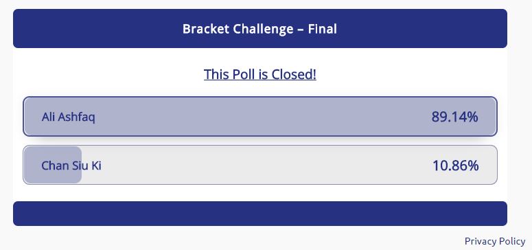 "އޭއެފްސީ ބްރެކެޓް ޗެލެންޖް" ގެ ފައިނަލުގައި ހޮންގްކޮންގެ އެންމެ ކާމިޔާބު ކުޅުންތެރިޔާ ޗަން ސިއު ކީ ތަފާތު ބޮޑުކޮށް ބަލިކުރުމަށްފަހު ރާއްޖޭގެ އިތުބާރު ފޯވާޑް އަލީ އަޝްފާޤް މި ޗެލެންޖް ކާމިޔާބު ކޮށްފިއެވެ.