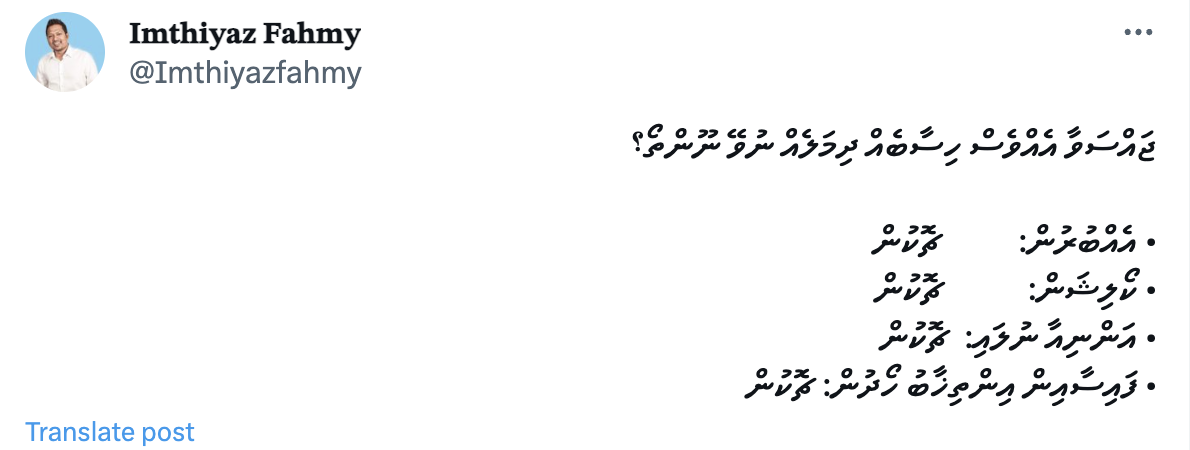 އެމްޑީޕީ އެއްވެސް ހިސާބެއް ދިމާނުވާކަމަށް އެމްޑީޕީގައި އިސް ދައުރެއް އަދާކުރައްވާ ދަ ޑިމޮކްރެޓްސްއަށް ބަދަލުވި، މާފަންނު އުތުރު ދާއިރާގެމެންބަރު އިމްތިޔާޒް ފަހުމީ (އިންތި) ވިދާޅުވެއްޖެއެވެ. އިންތި މިހެން ވިދާލޅުވީ، ތިން ކަމެއް ކޮށްފިނަމަ، އެމްޑީޕީ އަށް އިންތިހާބު ކާމިޔާބުވާނެކަމަށް ރައީސް އިބްރާހީމް މުޙައްމަދު ޞާލިޙް މިއަދު ވިދާޅުވުމާއި ގުޅިގެންނެވެ.