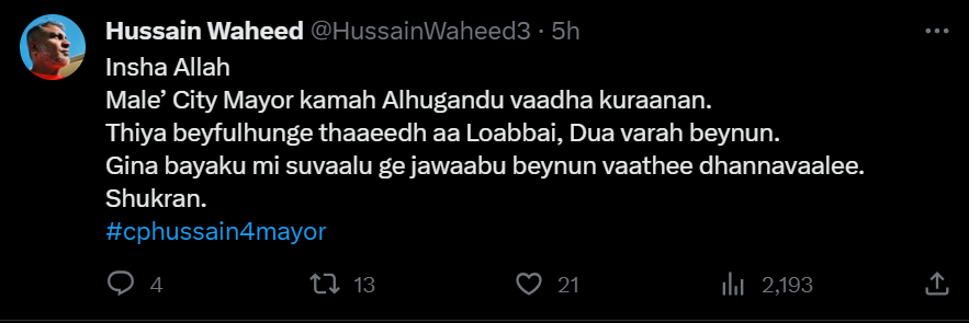 ހުސެއިން ވަހީދު ޓުވިޓާގައި ވިދާޅުވެފައިވަނީ 17 ނޮވެމްބަރު ވަނަ ދުވަހު ހުސްވާ މާލޭ މޭޔަރު މަގާމުގެ ބައި-އިލެކްޝަންގައި ވާދަކުރުމަށް ނިންމަވާފައިވާ ކަމަށެވެ. އެހެންކަމުން މާލޭގެ އެންމެހާ ރައްޔިތުން ތާއީދު ކޮށްދެއްވުމަކީ ވަރަށް ބޮޑު އެދުމެއް ކަމަށް ވިދާޅުވެފައިވެއެވެ.