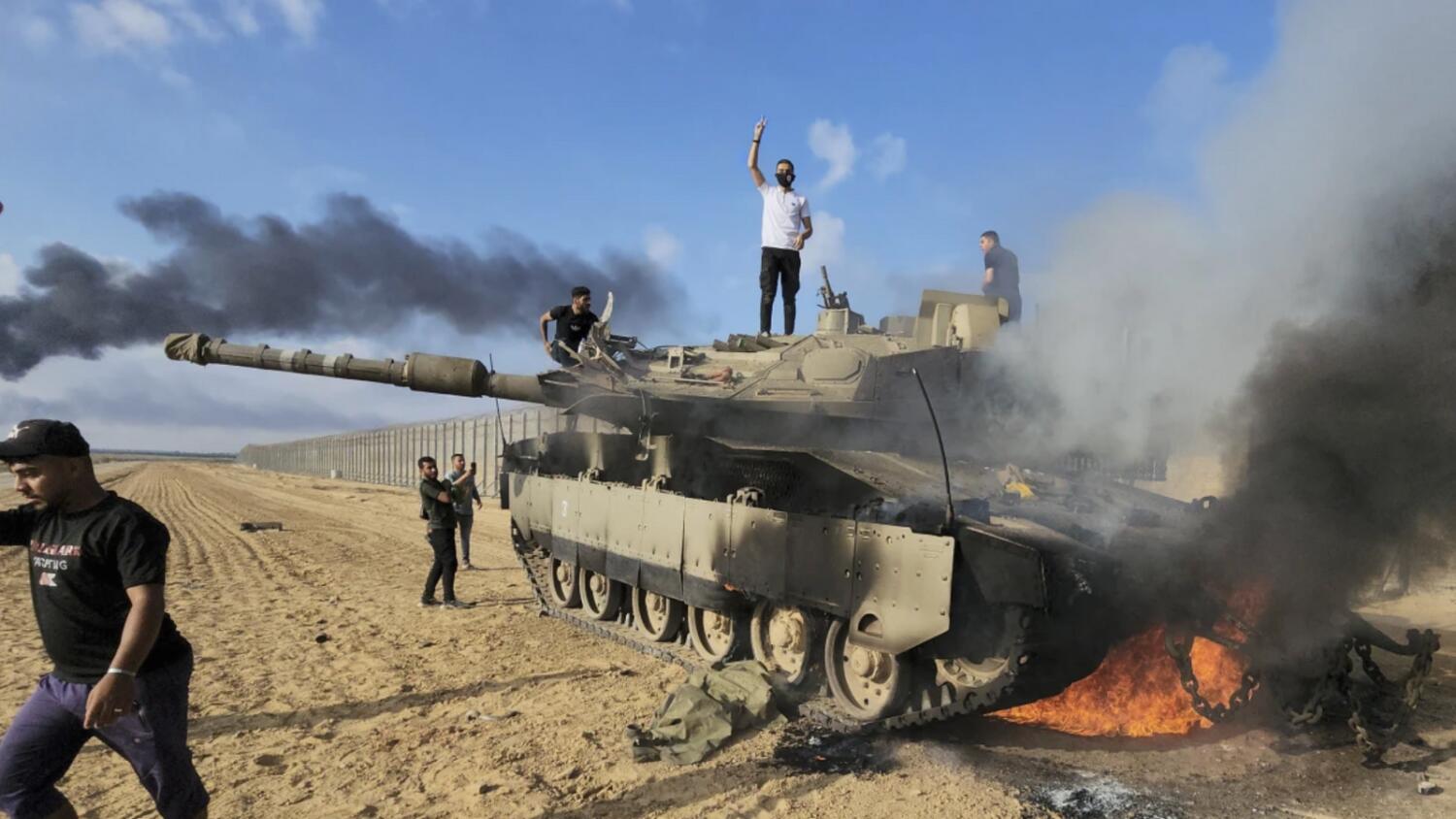 ހަލާކުވެފައިވާ އިސްރާއީލުގެ ޓޭންކެއްގެ މަތީގައި ފަލަސްތީނުގެ ޒުވާނުން