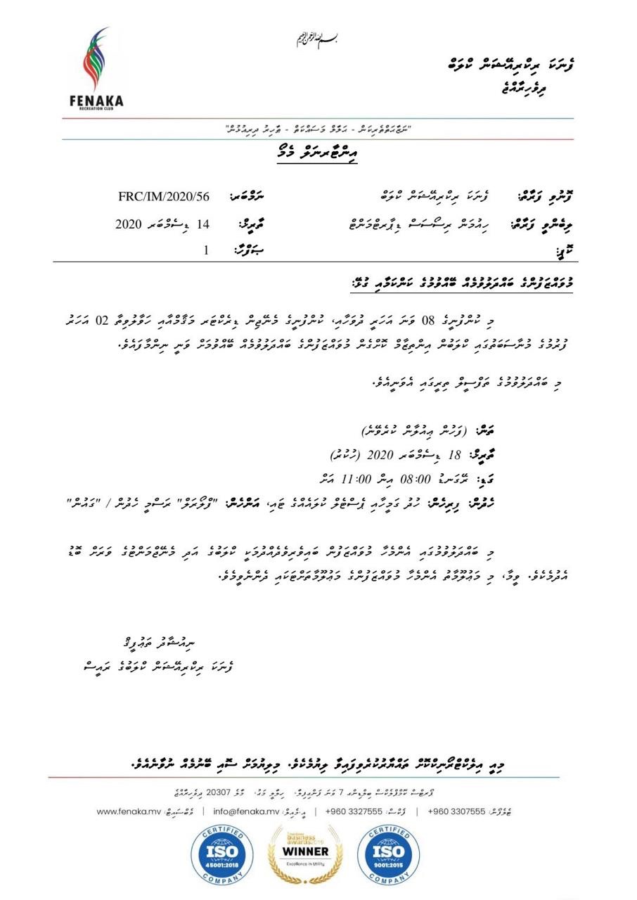 ފެނަކައިގެ ރެކްރިއޭޝަން ކްލަބުން އިސްނަގައިގެން ބާއްވާ މިބައްދަލުވުމަށް ފެނަކައިގެން ހުރިހާ މުވައްޒިފުންނަށް ވަނީ އިންޓަރނަލް މެމޯ އަކުން ދައުވަތު ދެވިފަައެވެ. މިމަހުގެ 14 ވަނަ ދުވަހު ފެނަކައިގެެ ހުރިހާ ޑިޕާޓްމަންޓަަކަށް ފޮނުވާފައިވާ މި މެމޯގައިވަނީ ފެނަކައިގެ 08 ވަނަ އަހަރީ ދުވަހާއި، ކުންފުނީގެ މެނޭޖިން ޑިރެކްޓަރ މަޤާމާއި ހަވާލުވިތާ 02 އަހަރު ފުރުމުގެ މުނާސަބަތުގައި ކްލަބުން އިންތިޒާމް ކޮށްގެން މުވައްޒަފުންގެ ބައްދަލުވުމެއް ބޭއްވުމަށް ހަމަޖެހިަފއިވާކަމަށެވެ.