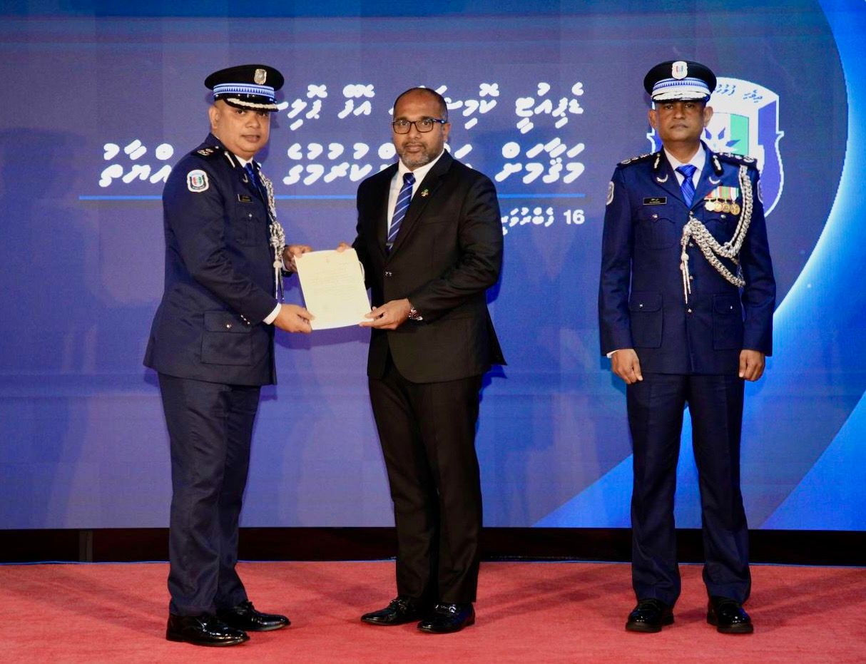 އިސްކަންދަރު ބިލްޑިންގގައި މިއަދު ބޭއްވި ރަސްމިއްޔާތުގައި އެސިސްޓަންޓް ކޮމިޝަނަރ އޮފް ޕޮލިސް ފަރުހާދު ފިކުރީ އާއި އެސިސްޓަންޓް ކޮމިޝަނަރ އޮފް ޕޮލިސް އިސްމާއިލް ނަވީންއަށް މަގާމަށް އައްޔަންކުރެއްވިކަމުގެ ލިޔުން ހަވާލުކޮށްދެއްވީ މިނިސްޓަރ އޮފް ހޯމް ލޭންޑް ސެކިއުރިޓީ އެން ޓެކްނޮލޮޖީ ޢަލީ އިހުސާން އެވެ.