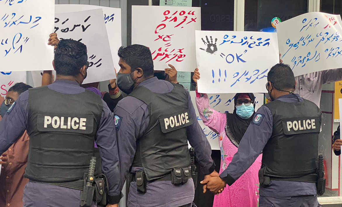 މުޒާހަރާގެ ބައިވެރިން ޖެންޑަރ މިނިސްޓްރީ ހުންނަ ބިއްލޫރިޖެހިގެ ހިމެނޭ ސަރަހައްދަށް މަޖީދީމަގަށް އެއްވުމާއެކު ފުލުހުން ވަނީ އެމީހުން ފަހަތައް ޖައްސާ، ފާށަނާ ކިލެގެ މަގާއި މަޖީދީމަގު ގުޅޭ ކަންމައްޗަށް ފަހަތަށް ޖައްސާފައެވެ.