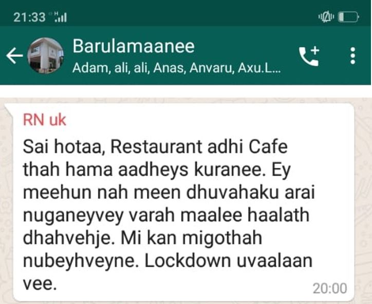 މަޖިލިސް ރައީސް މިފަދަ ގޮތަކަށް ވިދާޅުވެފައިވަނީ އެމަނިކުފާނު އިސްކޮށް ހުންނަވައިގެން ކުރިޔަށް ގެންދަވާ "ބަރުލަމާނީ" ވަޓްސް އެޕް ގްރޫޕުގައެވެ. މި ވަޓްސްއަޕް ގުރޫޕުގައި ދެއްކެވެމުންދިޔަ ވާހަތަކާއި ގުޅިގެން ރައީސް ނަޝީދު ގެންގުޅުއްވާ އިނގިރޭސި ވިލާތުގެ ނަންބަރުން ވިދާޅުވީ މިއަދު ހޮޓާ، ކެފޭ، ރެސްޓޯރެންޓުތަކުގެ ވެރިން ވަރަށް ބޮޑަށް ހާލުގައި ޖެހިފައިވާކަމަށެވެ. މިހާލަތުން އަރައިގަތުމަށް އަދި އެބޭފުޅުންނަށް ރަނގަޅު ގޮތްތަކެއް ހޯދުމަކީ ސަރުކާރުން ކުރަންޖެހޭ ކަމެއްކަމަށެވެ. މިކަން ކުރެވޭނީ މިހާރު އޮތް ލޮކްޑައުން އުވާލައި، މިކަން ނިމުމަކަސް ގެނެސްގެންކަމަށް މަޖިލިސް ރައީސް ވިދާޅުވިއެވެ.