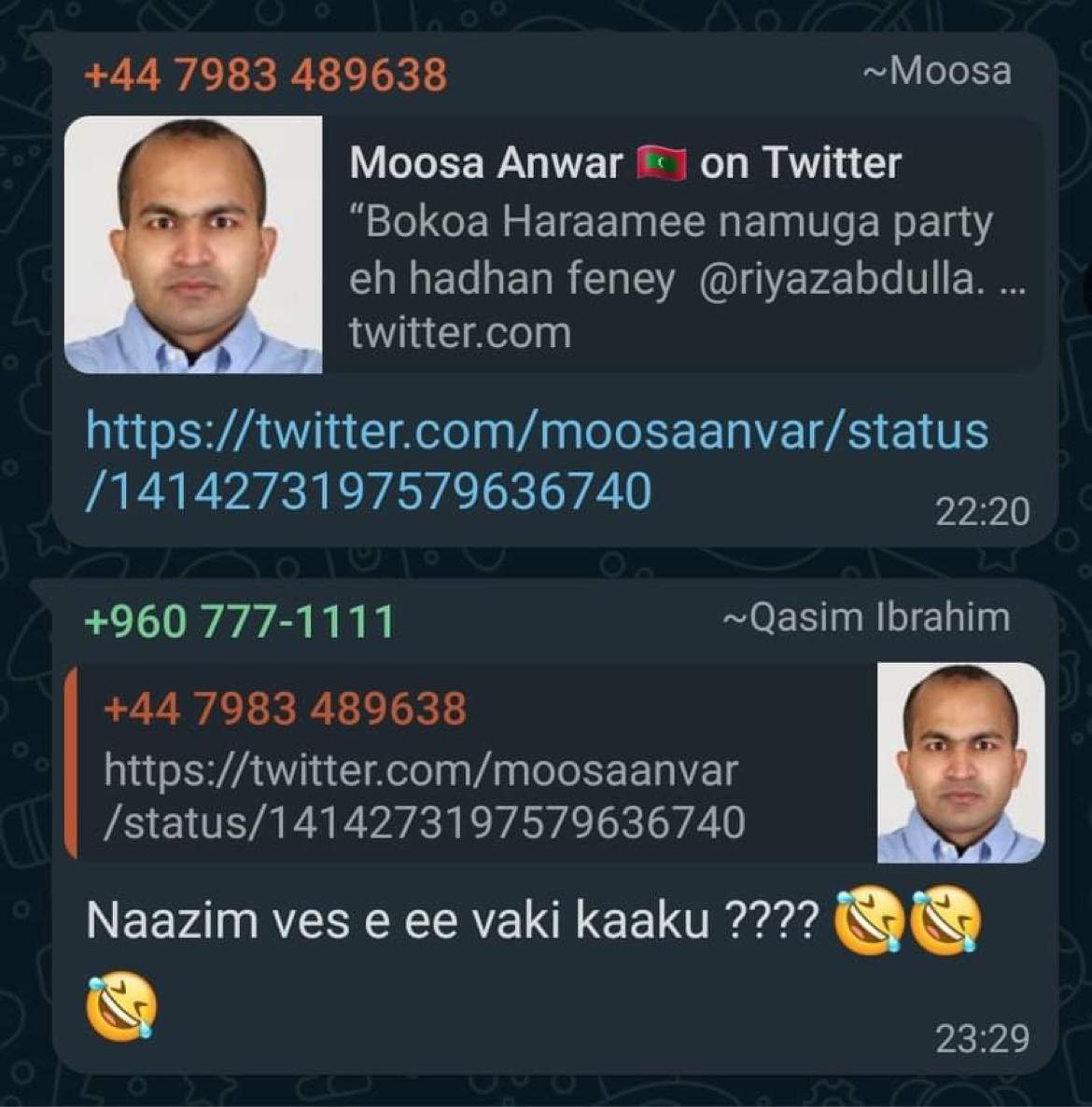 ޖުމްހޫރީ ޕާޓީގެ ޓެލެގްރާމް ގްރޫޕުގައި މިކަމާއި ގުޅޭގޮތުން ދެެކެވުނު ވާހަތަކުގައި ޤާސިމްވަނީ ހިނިގަނޑުގެ އިމޯޖީއެއް ފޮނުވަފައެވެ. އަދި ވިދާޅުވެފައިވަނީ ނާޒިމްވެސް އެއީ ވަކި ކަކުތޯ ކަމުގައެވެ.