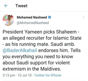 ޕީޕީއެމްގެ ރަނިންގ މޭޓަކަށް ޑރ. ޝަހީމް ހަމަޖެއްސުވުމާއެކު ރައީސް ނަޝީދު 2018 ވަނަ އަހަރު ކުރެއްވި ޓުވީޓު