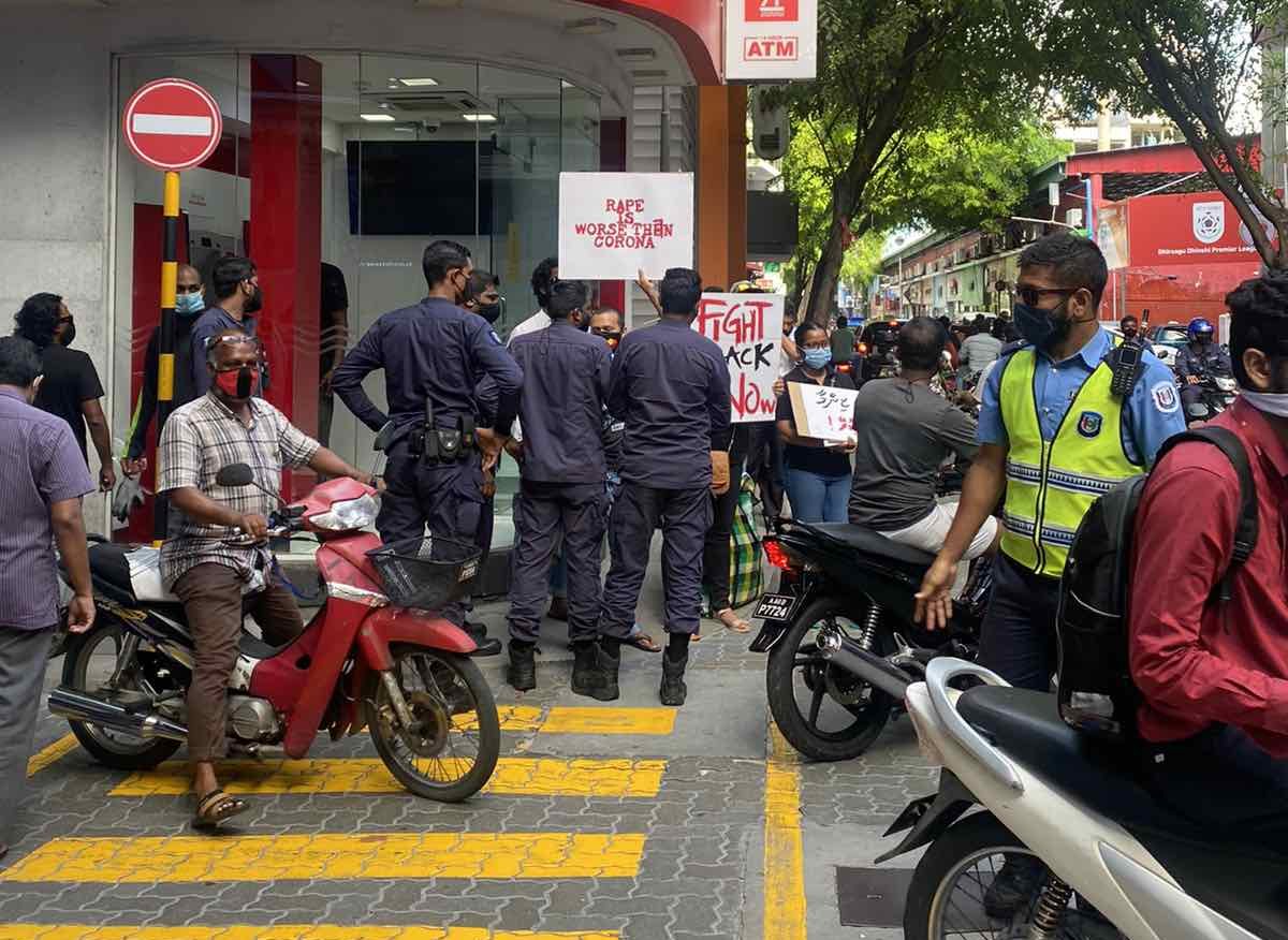 ޖިންސީ ގޯނާއާއި ރޭޕް ކުރުންފަދަ މައްސަލަތަކަށް އިންސާފު ނުލިބި، ދައުލަތުގެ އިސްވެރިންގެ ފަރާތްޕުޅުން އިވެމުންދާ ވާހަތަކާއި ގުޅިގެން މިކަންކަމާއި ދެކޮޅަށް މިއަދު މާލޭގައި ކުރުމަށް މަސައްކަތް ކުރި މުޒާހަރާ ފެށުމާއިއެކު އިސްކޮށް ހަރަކާތްތެރިވި ބައިވެރިން ފުލުހުންގެ ބެލުމުގެ ދަށަށް ގެންގޮސްފިއެވެ.