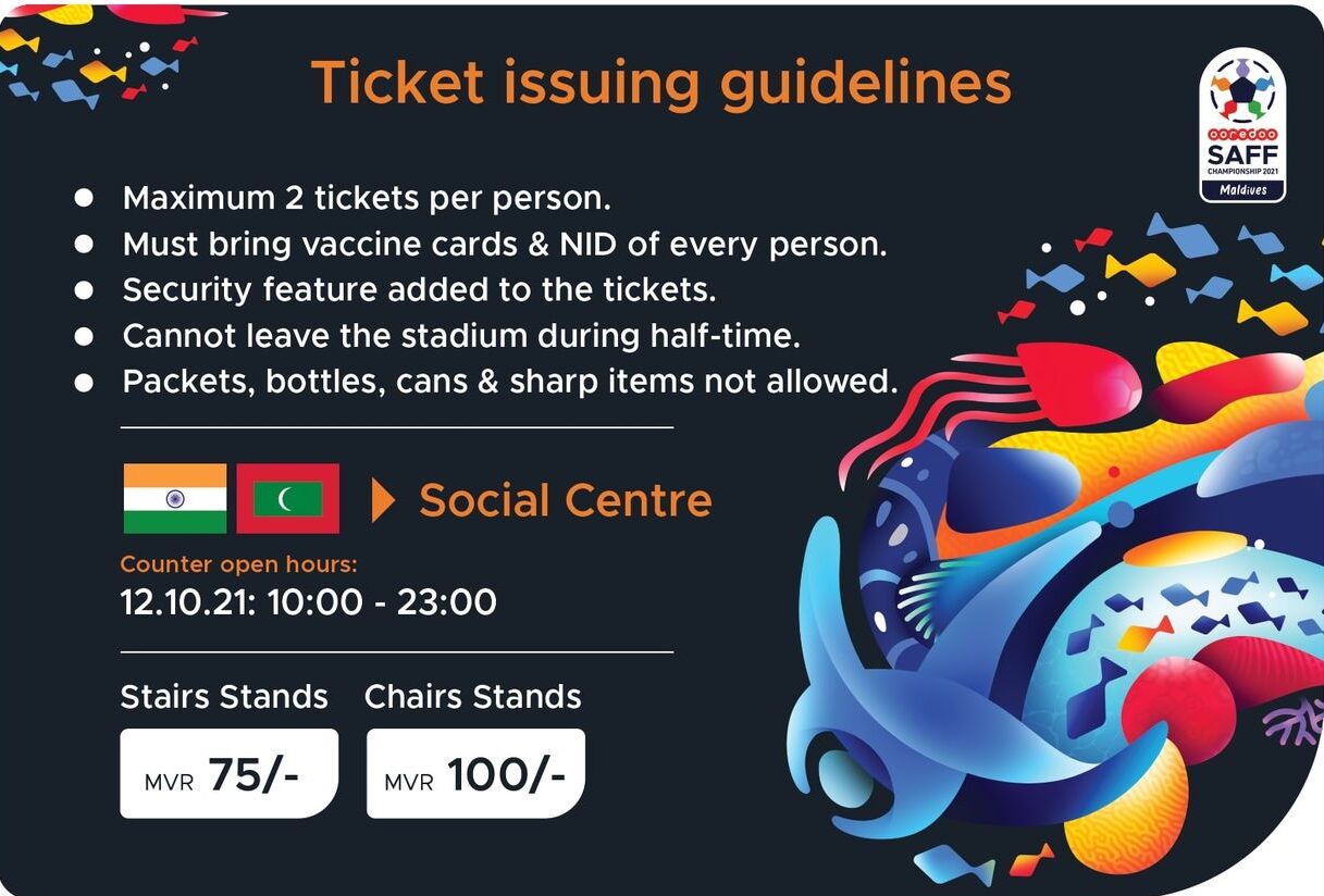 ރާއްޖެ އާއި އިންޑިއާ މެޗުގެ ޓިކެޓު ވިއްކުމަށް ހަމަޖެހިފައިވަނީ މާދަމާ ހެނދުނު 10:00 ޖަހާއިރުއެވެ. ސޯޝަލް ސެންޓަރު ސަރަހައްދުގައި ޖަހާފައިވާ ގޮނޑި ބަރީގައި ކިއު ހެދޭނީ 9:30 ގެ ފަހުންނެވެ.
