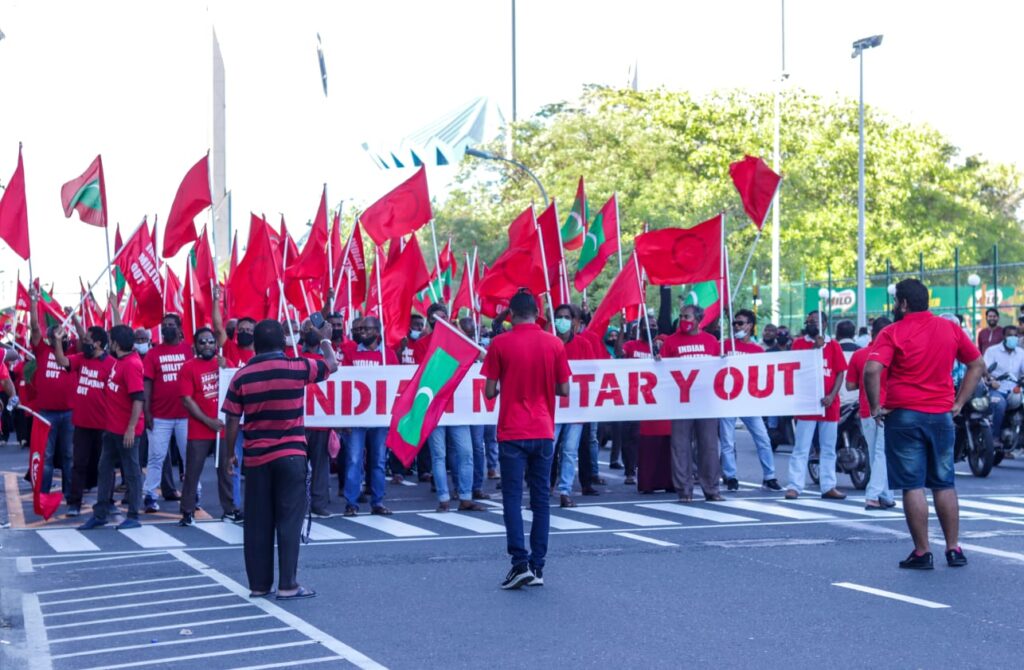 އެހެންނަމަވެސް، މިއާ ޚިލާފަށް، މިހާރު އިންޑިއާ ސަރުކާރާ ދެކޮޅު މުޒާހިރާތައް ކުރިޔަށް މިދަނީ، އިސްތިއުމާރީ ބާރަކުން ދިވެހިރާއްޖެ ހިސާރު ކޮށްފައި އޮވެގެން، އޭގެ އަޅުވެތި ކަމުން ގައުމު މިންޖު ކުރުމަށް ގޮވާލާ ބީދައިންކަން ފާހަގަ ކޮށްލަން ޖެއެވެ. މިއީ ދުނިޔޭގެ މަދު ގައުމެއްގައި މެނުވީ ހިނގަމުންދާ ޒާތުގެ މުޒާހިރާތަކެއް ނޫނެވެ.