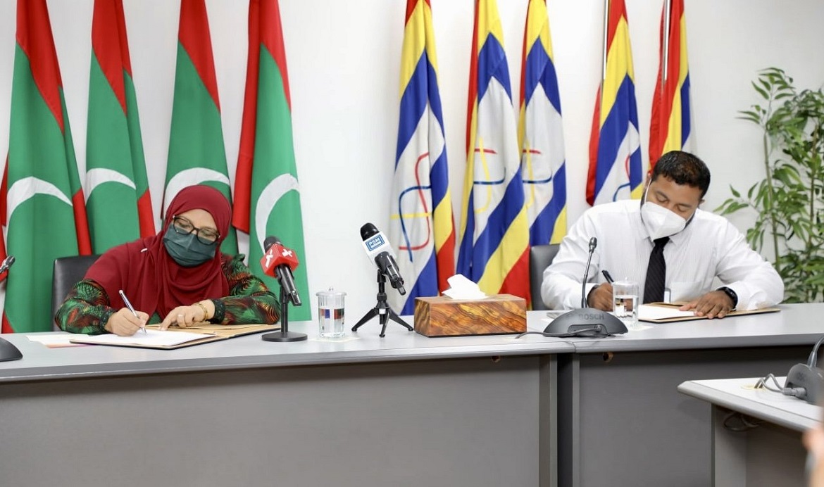 ހާއްސަ އެހީއަށް ބޭނުންވާ މީހުންގެ މަރުކަޒުގެ 5 ވަނަ ބްލޮކް މަރާމާތުކުރުމުގެ މަސައްކަތް ނިންމާ ޖެންޑަރ މިނިސްޓްރީއާ އިމާރާތް ހަވާލުކުރުމުގެ އެއްބަސްވުމުގައި ސްޓެލްކޯގެ ފަރާތުން ސޮއިކުރެއްވީ މެނޭޖިންގ ޑިރެކްޓަރ ޙަސަން މުޢުނީއެވެ. އަދި ޖެންޑަރ މިނިސްޓްރީގެ ފަރާތުން ސޮއިކުރެއްވީ މިނިސްޓަރ އާއިޝަތު މުޙައްމަދު ދީދީއެވެ.