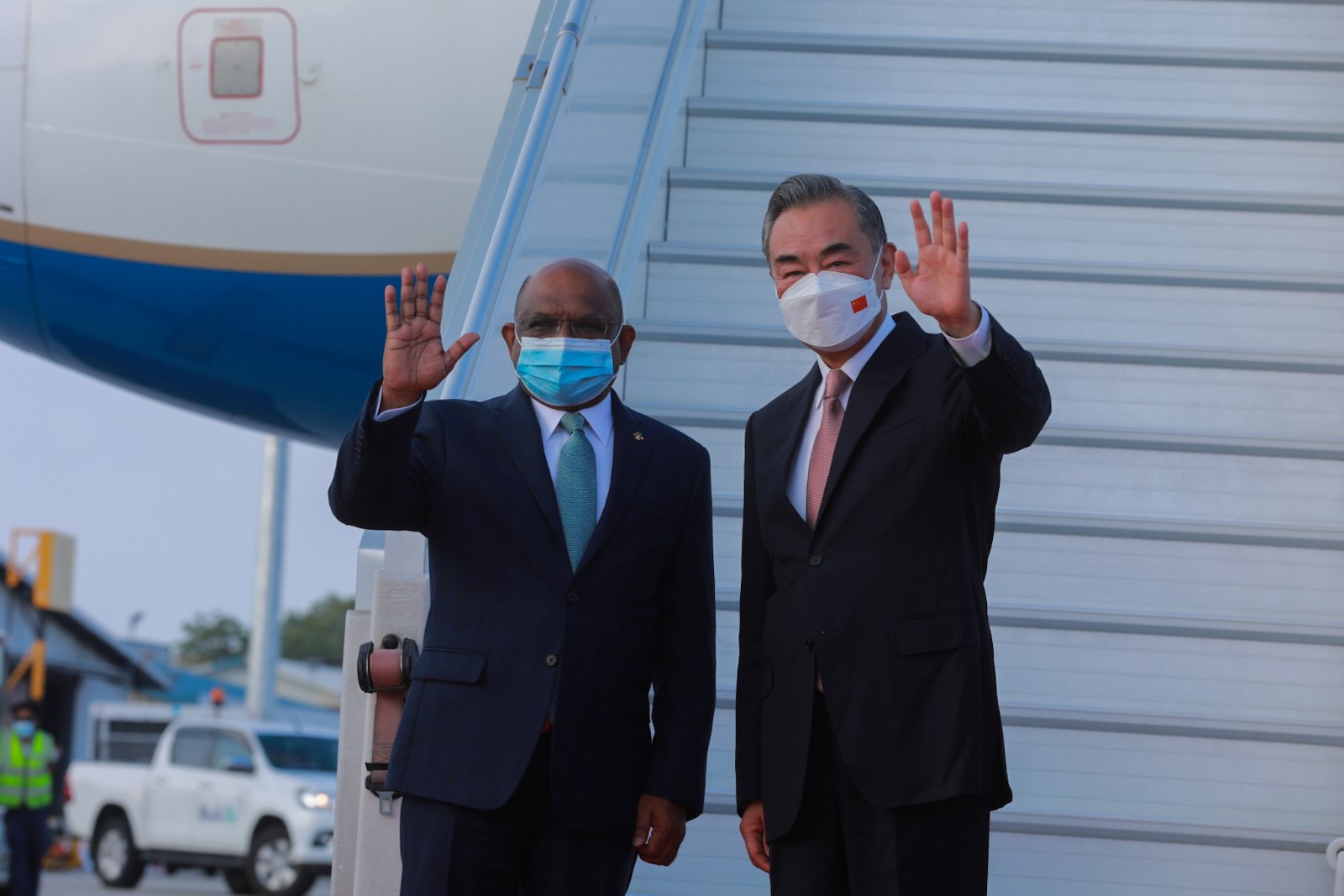 ޗައިނާގެ ފޮރިން މިނިސްޓަރަށް މަރުހަބާ ދެންނެވީ އދ.ގެ އާންމު މަޖިލީހުގެ ރައީސް އަދި ފޮރިން މިނިސްޓަރ އަބްދުﷲ ޝާހިދު، ފޮޓޯ: ފޮރިން މިނިސްޓްރީ