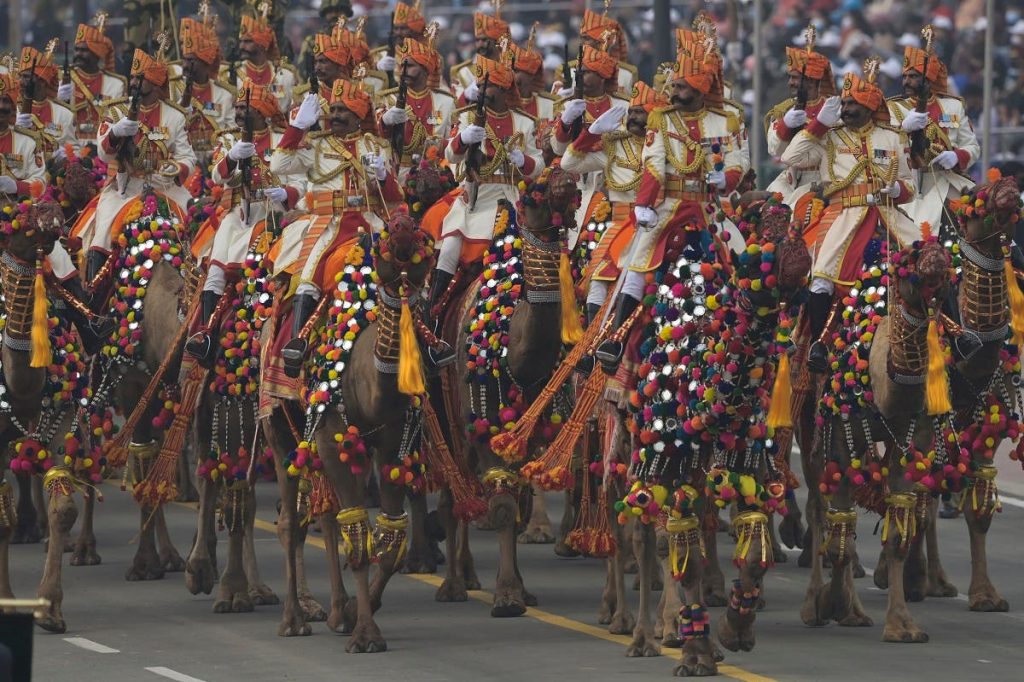 އިންޑިއާއިން އެގައުމުގެ ގާނޫނު އަސާސީ ބަލައިގަތް ދުވަސް ކަމުގައިވާ ޖެނުއަރީމަހުގެ 26ވަނަ ދުވަސް ފާހަގަ ކޮށްފައިވަނީ، މިސައިލް ލޯންޗުތަކާއި، މަތިން އުދުހެމުންދިޔަ ޖެޓްތަކާއި، މޮޓޯ ސައިކަލް ސްޓަންޓުތަކާއި، ޖަމަލު މަތީ ސަބާވަރުވެ ތިބި ބޯޑަރ ސެކިއުރިޓީ ފޯސްގެ ބްރާސް ބޭންޑުގެ މިއުޒިކާ އެކީއެވެ.
