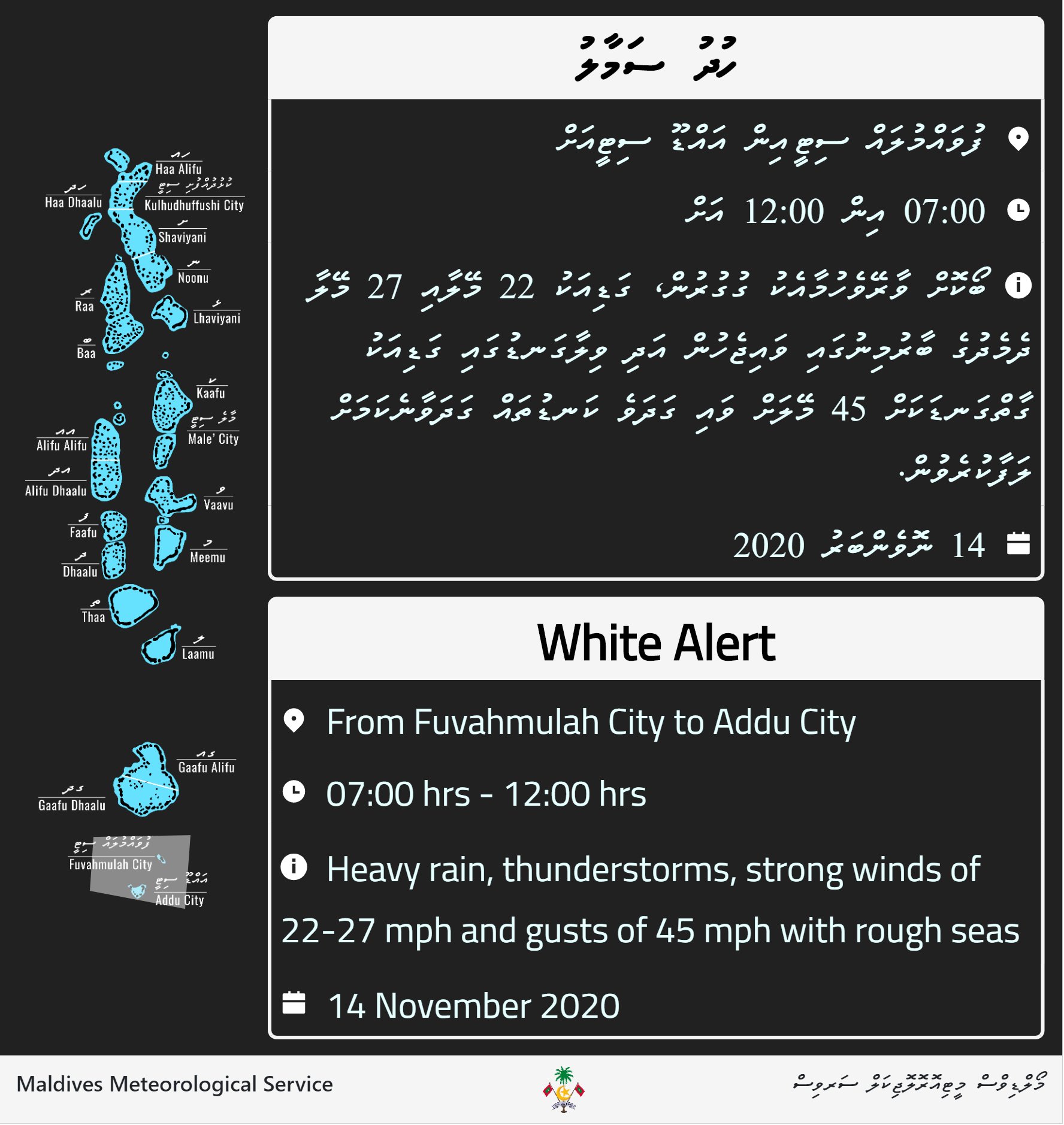 މޫސުމާބެހޭ ޤައުމީ އިދާރާއިން ވަނީ ރާއްޖޭގެ އެންމެ ދެކުނުކަމުގައިވާ އައްޑޫ ސިޓީން ފުވައްމުލަކު ސިޓީގައި މޫސުން ގޯސްވާނެކަމަށް ލަފާކޮށް، ވައިޓް އެލަރޓް ނެރެފައެވެ. އެލާޓް ނެރެފައިވަނީ މިއަދު ހެނދުނު 7 އިން 12 އާއި ދެމެދުގެ ވަގުތަކަށެވެ.
