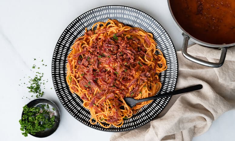 ފެންގަނޑު ކެކި ގަތީމައި އޭގެތެރެއަށް ޕާސްޓާކޮޅާއި މޭޒުމަތީ ސަމުސަލެއްގެ ތެޔޮކޮޅެއް އަޅާލާށެވެ. ބޭނުމިއްޔާ ލޮނު ކޮޅެއްވެސް އެޅި ދާނެއެވެ. ކޯންޑް ބީފްއަކީ ވަރަށް ލޮނުގަދަ އެއްޗަކަށް ވާތީވެ އަހަރުމެން އެޅީ ދެ އިނގިލިން ނަގާ ބުރުއްސާލެވޭވަރުގެ ލޮނުކޮޅެކެވެ.